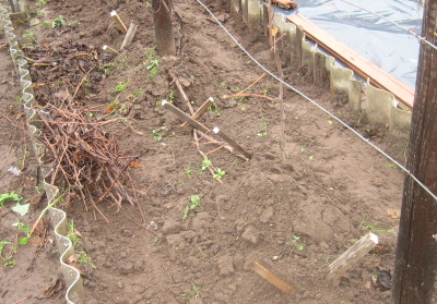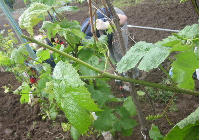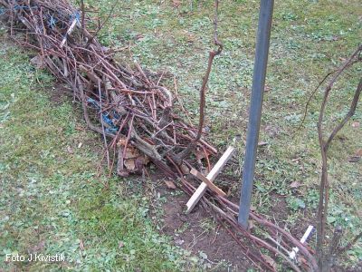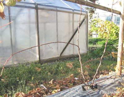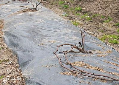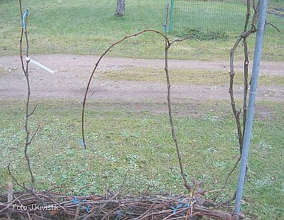 Sügisel paar nädalat pärast lehestiku kadumist lõigatakse ära korgistumata võrseladvad, painutatakse oksad maha ja kaetakse isegi talvekindlad sordid. Pildil viinapuud kevadel pärast katte eemaldamist. Esimene talv on viinapuu ellujäämisel otsustav. Talvitumine õnnestus kui kevadel on elus mõnedki pungad.
