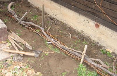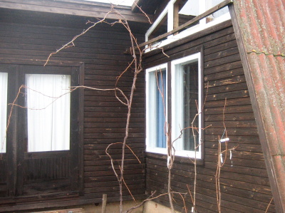 Hoone seina ääres võib viinapuud kujundada mitme meetri kõrguseks. Neid on lihtsam lõigata enne toestuselt lahtilõikamist. Seejärel lõigata läbi sidemed ja köitraod, hoidudes rebimisega okste vigastamisest. Järgmisel pildil näeme sama viinapuud maha painutatult.