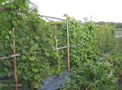 Kasutada võib kõige erinevamaid kujundusviise Paljudele sortidele sobib lühike lõikus - vanade okste kõik võrsed kärbitakse pärast 3-4 punga. Võib lõigata nagu vaarikaid - eemaldatakse kõik viljakandnud oksad maapinnani ja jäetakse järgmise aasta saagiks juba suvel välja valitud asendusvõrsed. Pildil on osa oksi maha painutatud, teised toestusele jäetud. Vasakule suunduval oksal tuleb kärpida korgistumata latv.