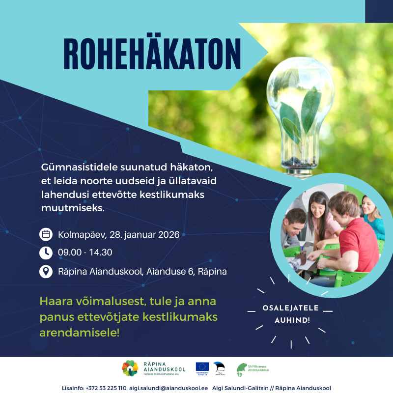 Räpina Aianduskoolis toimub 28. jaanuaril gümnasistidele suunatud rohehäkaton, mille fookuses on noorte poolt pakutavad lahendused ettevõtete kestlikumaks muutmiseks. Häkatoni käigus otsitakse uudseid ja loovaid ideid, mis toetavad ettevõtete jätkusuutlikku arengut.